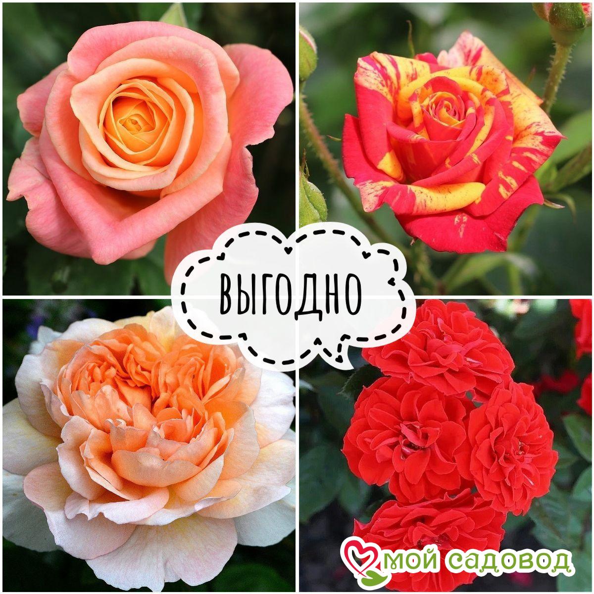 Четыре разных вида роз в одном комплекте. Это идеальный вариант для создания уютного сада! В комплект вошли следующие сорта роз: Роза чайно-гибридная Мисс Пигги — обильному и неоднократное цветение, роза способна держать свежий вид после срезки до 15 дней. Аромат приятный и ненавязчивый, качества его не портятся даже при хранении срезанного цветка. Бутон красивой правильной формы бокала. Цвет бутона, как и полностью распустившегося цветка, неоднозначен. Нежный розовый цвет лепестков закручивается в персиковые нотки в середине цветка. Даже в полном роспуске цвет смотрится так же приятно и загадочно. На солнце практически не выгорает, сохраняя все оттенки перехода цветов. Цветок махровый с большим количеством лепестков, распускается на прямом ровном стебле по 1, иногда по 2-3 шт. Темно-зеленая кожистая листва отлично подчеркивает нежные тона бутона. Куст высотой 50-80 см. https://мойсадовод.рф/product/roza-chajno-gibridnaya-miss-piggi Роза спрей Файер Флеш – одна из самых красивых роз сорта «спрей». Отличается оригинальной двухцветной окраской бутонов, в середине — желтые, а по краям ярко-малиновые. Оригинальный кустик, который трудно спутать с другими разновидностями семейства розоцветных. Эта роза спрей характеризуется кистеобразным цветением: на одной кисточке можно насчитать от пяти до десяти цветков размером от пяти до шести сантиметров. Высота куста- не более 70 см при ширине всего полметра. https://мойсадовод.рф/product/rozy-sprej-fajer-flesh Плетистая роза Гримпант Оранж Мейландина — Плетистая роза с оранжевыми махровыми цветками диаметром 9 см розеточной формы. Быстрорастущая, цветение обильное, поодиночке и в соцветиях, повторное, весь сезон до заморозков. Листва темно-зеленая, полуматовая, кожистая. https://мойсадовод.рф/product/roza-grimpant-oranzh-mejlandina-pletistaya Английская роза Роза Леди Гарденер — большие густомахровые цветки диаметром около 10 см прекрасного ярко-абрикосового цвета более светлые к краям. Множество лепестков свободно собраны вокруг цветного глазка в густомахровую розетку характерной крестообразной (квадрированной) формы. Великолепная садовая роза с обильным повторным цветением. Очень здоровая и устойчивая к дождю. Имеет особенный приятный сильный аромат чайных роз с нотками кедра и ванили. В зависимости от обрезки куст достигает 1-1,25 м в высоту и 1,25 м в диаметре. https://мойсадовод.рф/product/roza-ledi-gardener