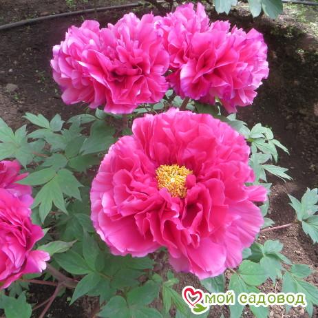 Один из лучших красных сортов пионов. Цветки полумахровые диаметром 20-25 см. Окраска цветка яркая розово-красная, центр жёлтый. Лепестки блестящие, гофрированные. Верхняя часть лепестков в процессе цветения становится красновато-фиолетовой. Куст высотой 120-150 см. Побеги сильные, вертикальные. Аромат лёгкий, пряный. Цветение обильное с мая по июнь. На одном кусте может быть от 30 до 70 цветков. Пион древовидный — морозоустойчивый кустарник, достигающий высоты до 2 м, с крупными ярко-зелеными листьями. На одном кусте может быть от 30 до 70 цветков. Диаметр каждого от 20 до 25 см. Продолжительность цветения 12—14 дней. Растение декоративно и после цветения из-за необычной формы листьев. Пион неприхотлив, устойчив к болезням. На одном месте без пересадки может расти более 20 лет. Место посадки Для посадки пионов понадобится защищенное от ветров место с хорошей освещенностью. Сорта светлой окраски, а также пионы с простыми и полумахровыми цветками можно посадить на частично затеняемом участке, это продлит цветение и защитит цветы от выгорания.   ХРАНЕНИЕ ДО ПОСАДКИ: После получения посылки, рекомендуем вскрыть пакет и осмотреть корневище. Почки должны быть плотные и розового цвета. Так же уделите внимание самому корневищу, все сомнительные, потемневшие, сморщенные части удалите, а места среза обработайте зеленкой или залой. Если почки еще не тронулись в рост, а высаживать в открытый почву рано, советуем Вам хранить корневище в холодильнике, обязательно оставляя его в пакете с торфяной смесью или в коробке под снегом. Если почки успели раскрыться это не критично, сохранить до посадки их так же возможно, высадите корень пиона в большой просторный горшок или в любую другую ёмкость.